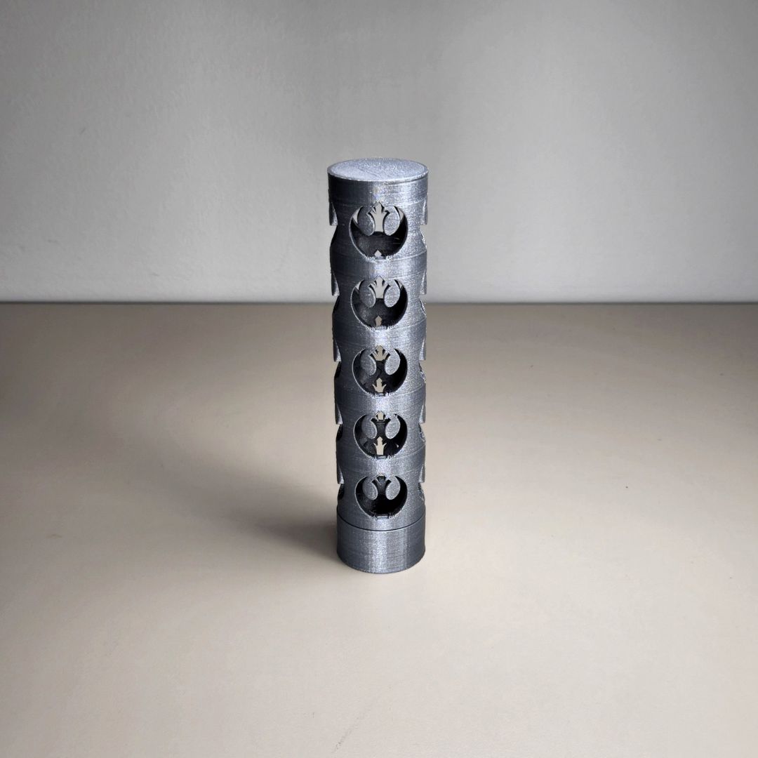 Keep your pencils and pens together in a clean, travel ready format with this 3D printed Galactic Insignia Pencil Case. The tall cylindrical tube features repeating emblem cutouts that give it a bold sci fi look while keeping the case lightweight. A secure lid helps keep your writing tools contained in a backpack, tote, or desk drawer.